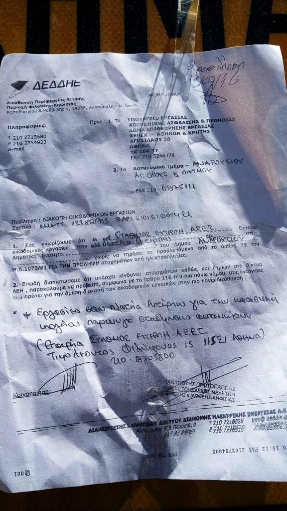 Συγκεκριμένα, ήδη από τις 19-7-2016, η ΔΕΔΔΗΕ ΑΕ (ΔΙΑΧΕΙΡΙΣΤΗΣ ΕΛΛΗΝΙΚΟΥ ΔΙΚΤΥΟΥ ΔΙΑΝΟΜΗΣ ΗΛΕΚΤΡΙΚΗΣ ΕΝΕΡΓΕΙΑΣ Α.Ε) θυροκόλλησε στο εργοτάξιο έγγραφο περί διακοπής των εργασιών επειδή δεν τηρήθηκαν οι προϋποθέσεις του νόμου για πρόληψη ατυχημάτων από ηλεκτροπληξίες. Το ίδιο έγγραφο κοινοποιήθηκε και στο Αστυνομικό Τμήμα Αμαρουσίου, ως αρμόδιο, για να επιμεληθεί την διακοπή των εργασιών, εφαρμόζοντας το νόμο.