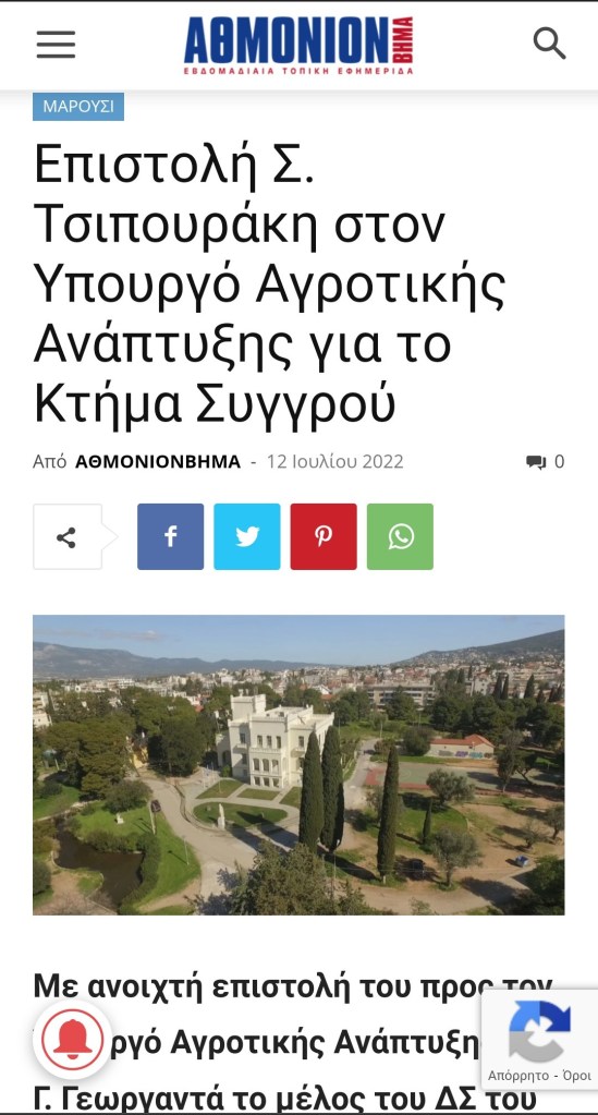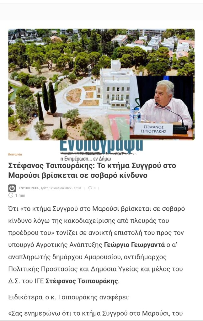 Σας ενημερώνω ότι το κτήμα Συγγρού στο Μαρούσι, του οποίου το Υπουργείο είναι η Εποπτεύουσα Αρχή – συνολικής εκτάσεως περίπου χιλίων στρεμμάτων, μοναδικό στην Ελλάδα και σημαντικός πνεύμονας πρασίνου και παράγοντας ευζωίας στην περιοχή μας – βρίσκεται σε σοβαρό κίνδυνο λόγω της κακοδιαχείρισης από πλευράς του Προέδρου του, η συμπεριφορά του οποίου έχει οδηγήσει σε παραίτηση μεγάλο αριθμό μελών του Διοικητικού Συμβουλίου του Ι.Γ.Ε..
