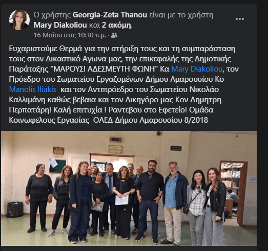 Η Μαίρη Διακολιού, επικεφαλής της μη κομματικής, ανεξάρτητης παράταξης «Μαρούσι Αδέσμευτη Φωνή» στις 16/5 ανταποκρίθηκε στο αίτημα π. εργαζόμενων του Δήμου Αμαρουσίου (σ.σ.: που μετά από πολλά χρόνια προσφοράς, απολύθηκαν και έκτοτε ταλαιπωρούνται δικαστικά), να καταθέσει ως μάρτυρας υπέρ τους στην εκδίκαση της προσφυγής τους, προκειμένου να αποκατασταθούν στις θέσεις που εργάζονταν για πολλά χρόνια.