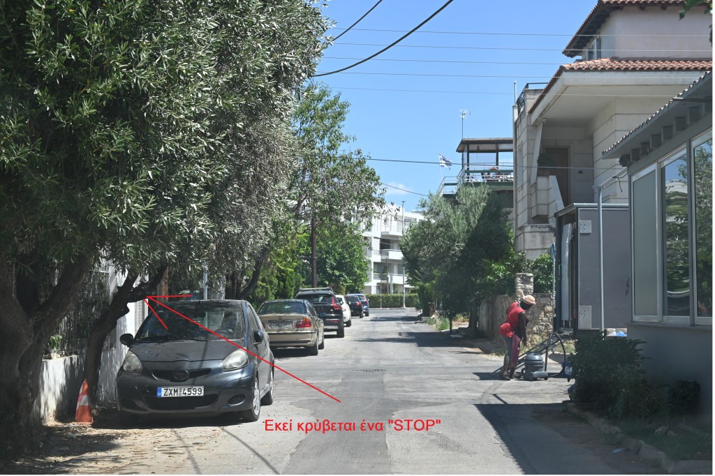 Επειδή όμως η παράταξή μας θέλει να ασκεί ολοκληρωμένα τα καθήκοντά της, παραθέτει φωτογραφίες και της αφάνειας του σήματος «STOP». Οδηγήσαμε με αυτοκίνητο στην οδό Βάκχων, από την έξοδο του Mac Donald’s, και στην φωτογραφία που ακολουθεί παραθέτουμε την οπτική που ΔΕΝ έχουν οι οδηγοί στο «STOP» που τοποθέτησε εκεί -δήθεν- για να ικανοποιήσει τα αιτήματα των κατοίκων της γειτονιάς η κακοδιαχείριση Αμπατζόγλου: