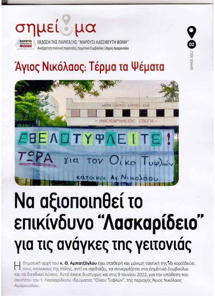 Πριν ενάμιση χρόνο, στις 9 Ιουνίου του 2022, οι κάτοικοι της περιοχής του Αγίου Νικολάου Αμαρουσίου πραγματοποίησαν μία εκδήλωση διαμαρτυρίας για την χρόνια εγκατάλειψη του κτηρίου του «Λασκαρίδειου Ιδρύματος» (σ.σ.: εκεί που στεγαζόταν ο «Οίκος Τυφλών»). Εγκληματικά στοιχεία κατά σύστημα εισέρχονταν στο συλημένο κτήριο για διάφορες «χρήσεις», ενώ στο σχετικά μεγάλο κτήμα του η βλάστηση είχε αφεθεί πυκνή και ξερή, με κίνδυνο πυρκαγιάς μέσα στο κέντρο της γειτονιάς.