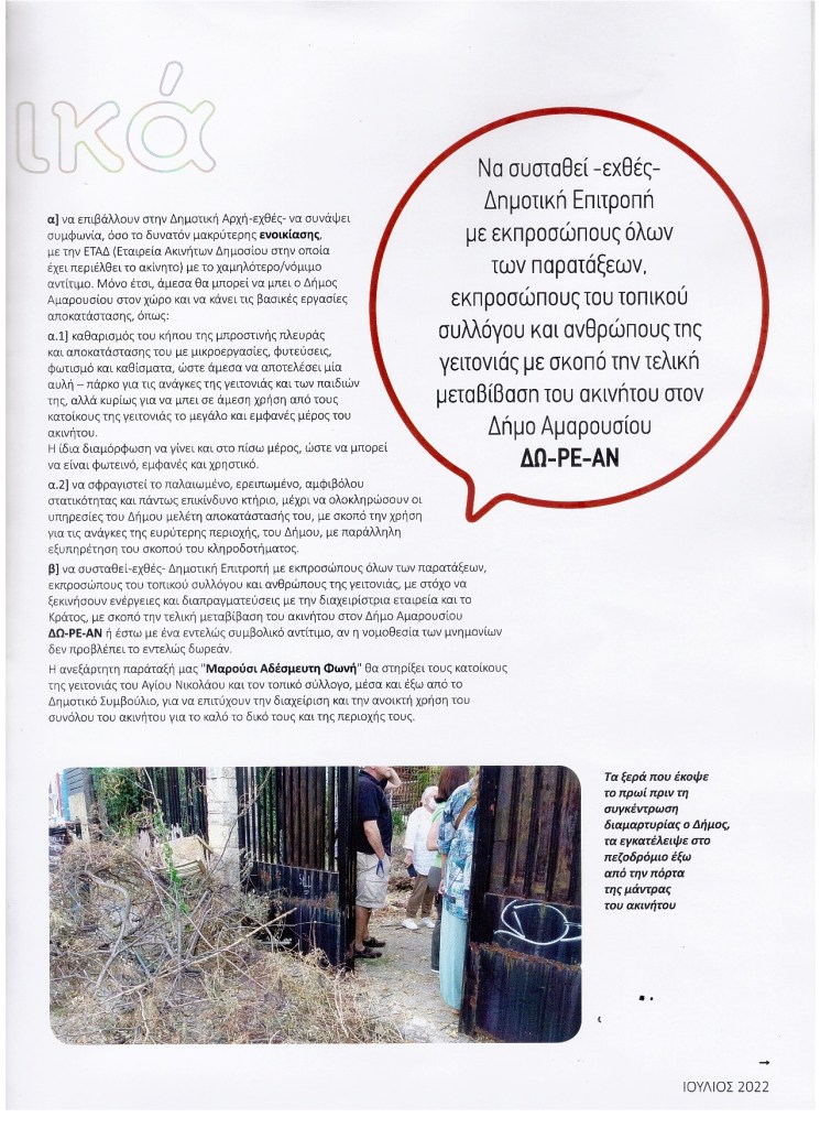 Μετά από λίγες ημέρες, στις αρχές Ιουλίου 2022, η παράταξη μας τύπωσε την πολιτική πρότασή της σε τετρασέλιδο έντυπο το οποίο διένειμε στα σπίτια της γειτονιάς του Αγίου Νικολάου Αμαρουσίου. [βλέπε: φωτογραφίες]