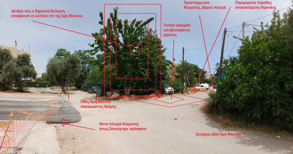 Εσκεμμένα δε, παραποιείται η αλήθεια και αναφέρεται σε σχετικά έγγραφα του Δήμου Αμαρουσίου, ότι τα προς κοπή δένδρα βρίσκονται τάχα στην συμβολή Κέκροπος και Λάρνακος (που δεν τέμνονται στο σκέλος της κανονικής Λάρνακος που ανήκει στην ευθύνη του Δήμου και που έχει ήδη διαμορφωθεί), ώστε πλασματικά να εμφανίζεται ότι η επιχειρούμενη παρέμβαση καλύπτεται από τη σύμβαση με τον εργολάβο, ενώ η αλήθεια είναι ότι πρόκειται για παρέμβαση στο Ρέμα Σαπφούς, χωρίς καμία άδεια.
