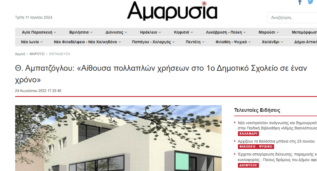 Στις 31/05/24 η Δημοτική Επιτροπή του Δήμου Αμαρουσίου αποφάσισε, δια της πλειοψηφίας της δημοτικής διοίκησης Αμπατζόγλου, την οριστική (συναινετική) διάλυση της σύμβασης με την ανάδοχο εταιρεία που είχε αναλάβει πριν περίπου δύο χρόνια την κατασκευή του έργου της αίθουσας εκδηλώσεων του 1ου Δημοτικού Σχολείου Αμαρουσίου.